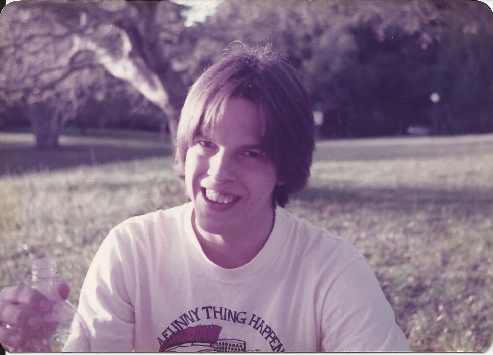 See, when I was in college, there was this absolutely beautiful woman who started working in the college dish room during a couple of my shifts. She was pretty, she was wicked smart, she was funny, she had a ridiculously adorable laugh, and she fit right in with the dirty, disgusting team of stoner guys who also worked the shift. (I mean dirty as in “covered with meal debris due to the job” type, not sexually. They were real gentlemen to her, the only woman on the shift.) Of course all the other guys were interested in her, flirted with her, hoped she would go out with them. I totally wrote her off. I was a nerd, a nebbish, and skinny and slightly built to boot. Women like that not only had ignored me in high school, they had actively made fun of me. She was out of my league. Way way way out of my league. I mean, look at me; this was taken that very year: